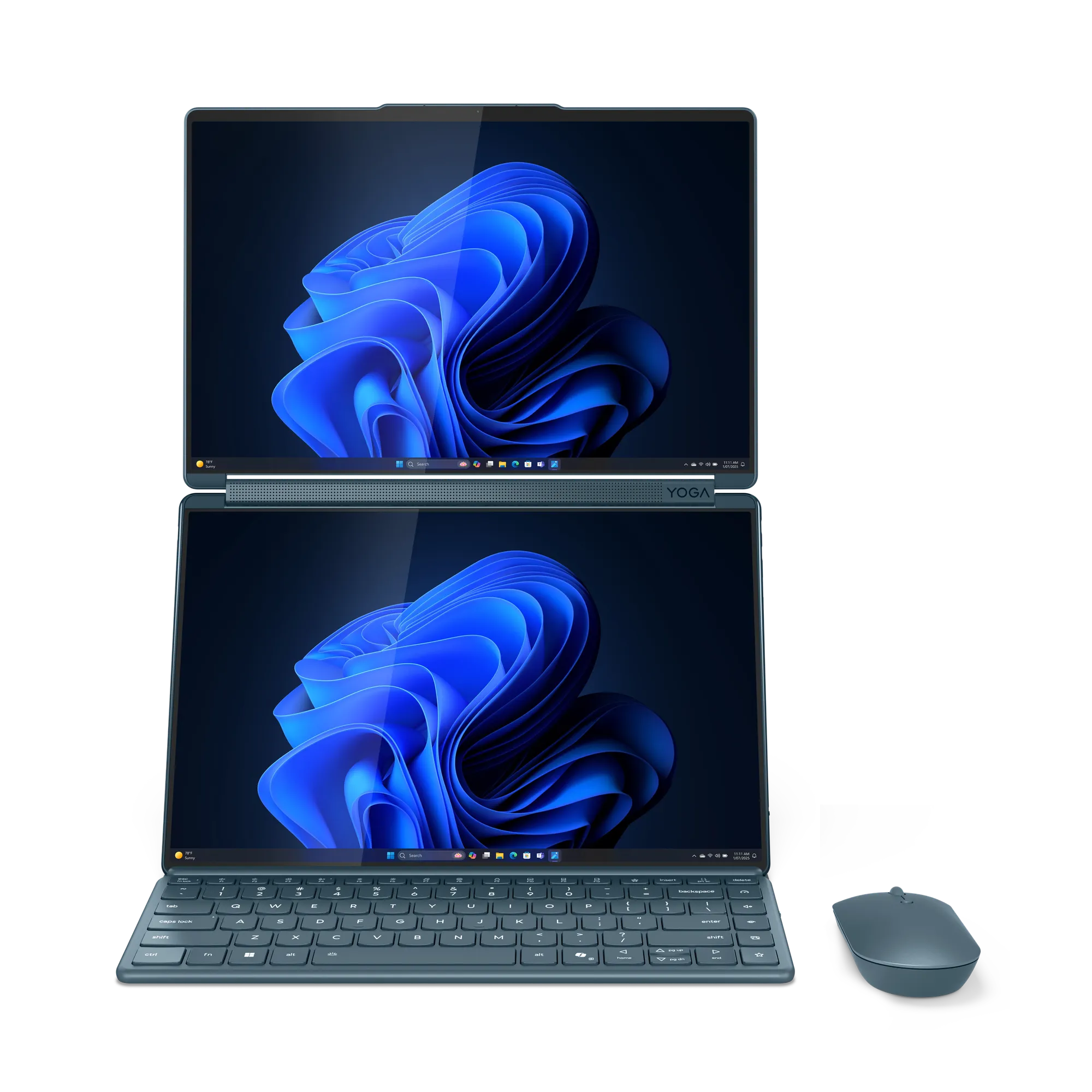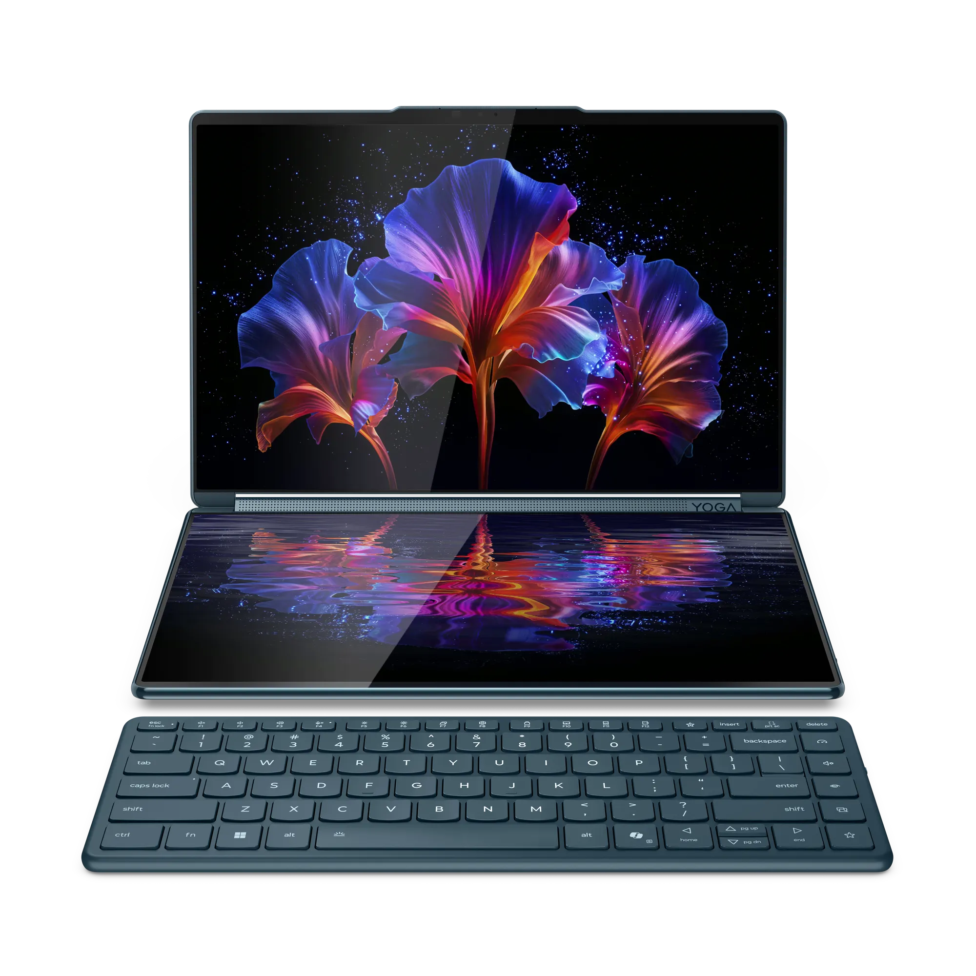 Le Lenovo Yoga Book 9i Gen 10 adopte une finition « Cosmic Blue » qui tranche avec les gris ternes habituels du segment pro. La charnière à 360° permet de basculer entre les modes laptop, tente, tablette et livre. C'est un classique du format Yoga, mais ici appliqué à un appareil entièrement bi-écran.